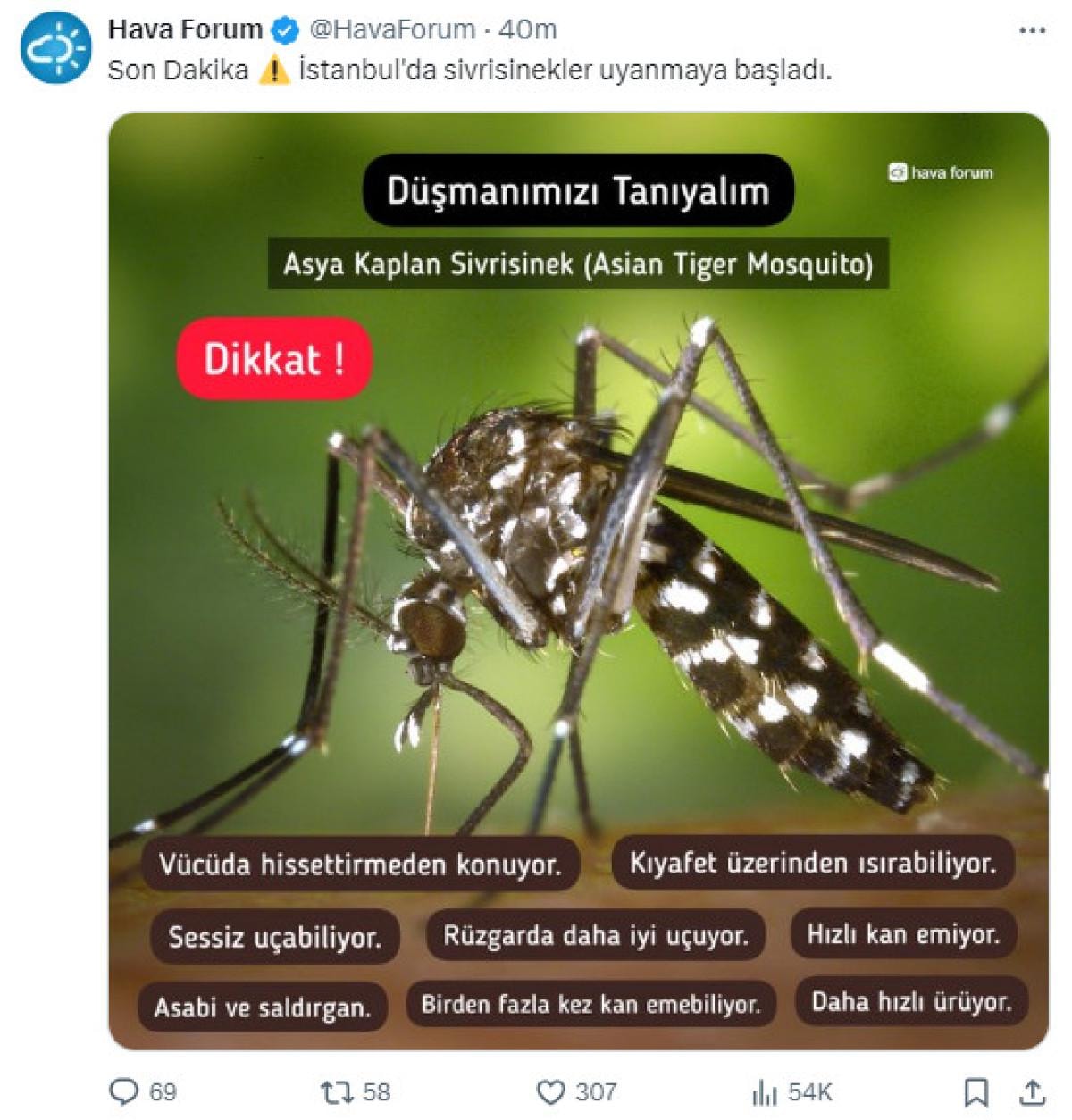 Hava Forum, X hesabından yaptığı paylaşımla İstanbul'da sivrisineklerin uyanmaya başladığını duyurdu.
