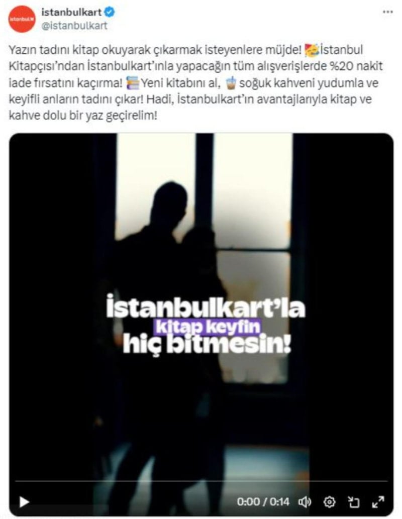 “Yazın tadını kitap okuyarak çıkarmak isteyenlere müjde! İstanbul Kitapçısı’ndan İstanbulkart’ınla yapacağın tüm alışverişlerde %20 nakit iade fırsatını kaçırma! Yeni kitabını al, soğuk kahveni yudumla ve keyifli anların tadını çıkar! Hadi, İstanbulkart’ın avantajlarıyla kitap ve kahve dolu bir yaz geçirelim!”