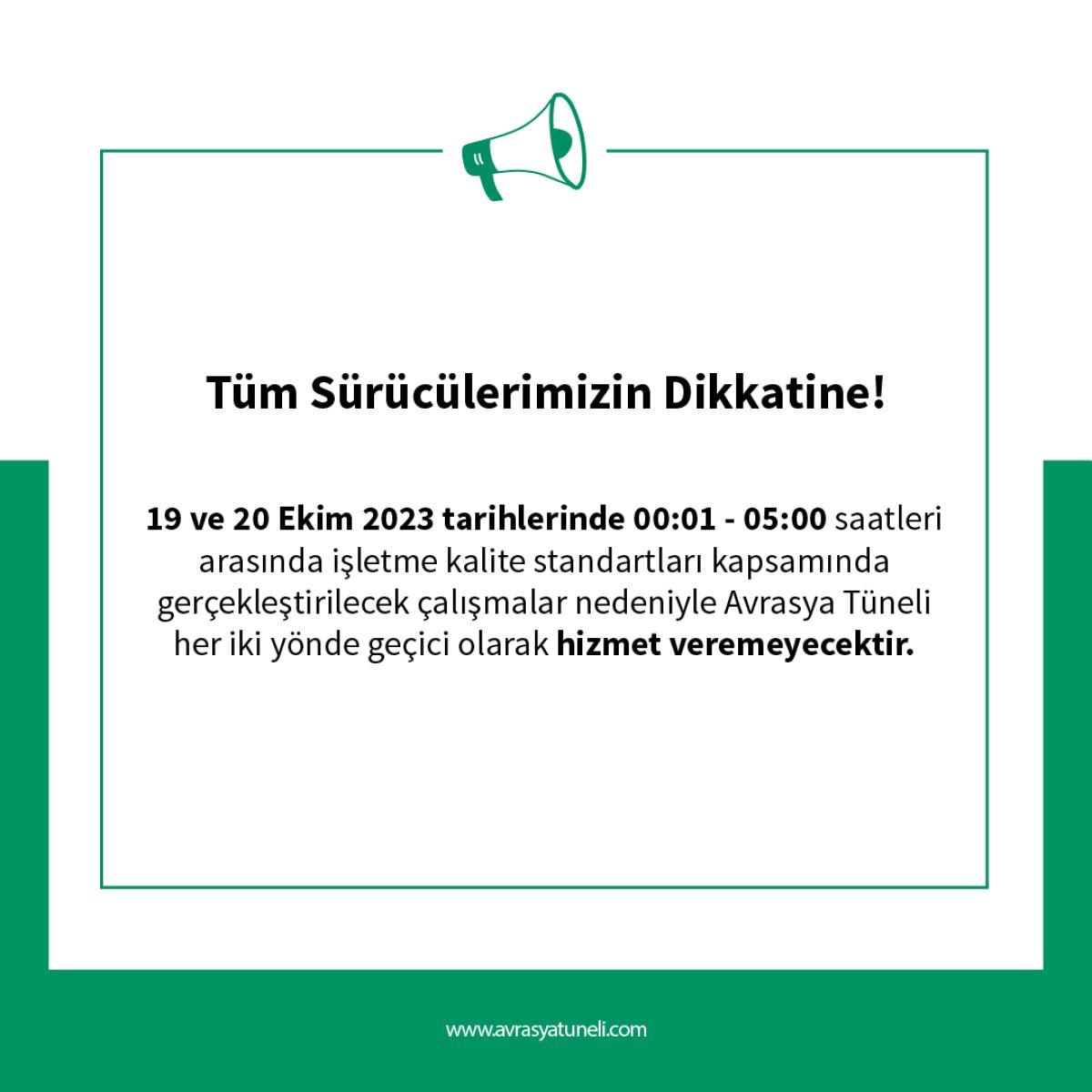 "19 ve 20 Ekim 2023 tarihlerinde 00:01-05:00 saatleri arasında işletme kalite standartları kapsamında gerçekleştirilecek çalışmalar nedeniyle Avrasya Tüneli her iki yönde geçici olarak hizmet veremeyecektir"