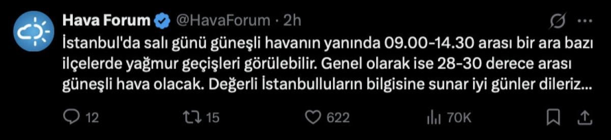“İstanbul'da salı günü güneşli havanın yanında 09.00-14.30 arası bir ara bazı ilçelerde yağmur geçişleri görülebilir. Genel olarak ise 28-30 derece arası güneşli hava olacak. Değerli İstanbulluların bilgisine sunar iyi günler dileriz…”