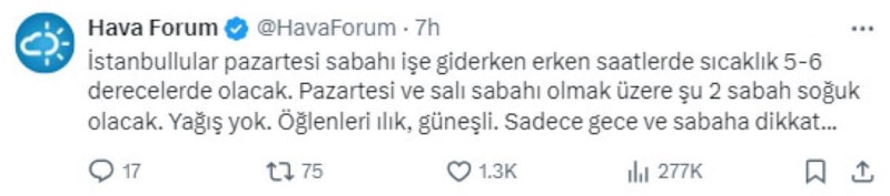 Meteoroloji kaynağı Hava Forum, sosyal medya hesabından yaptığı paylaşımla İstanbulluları uyardı.