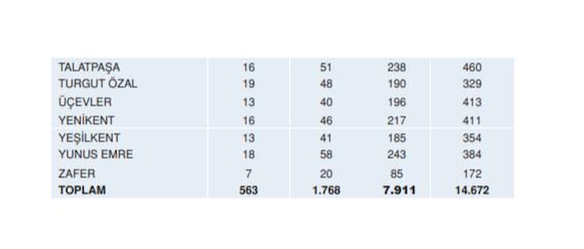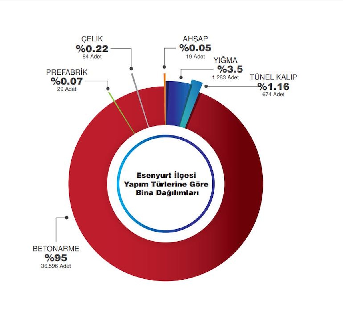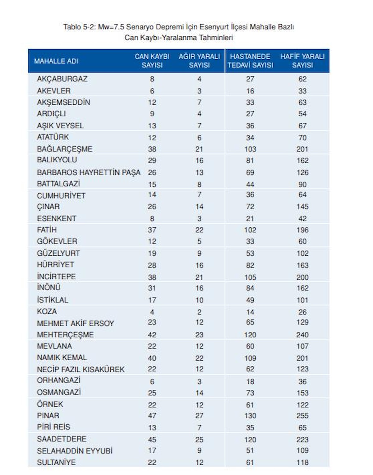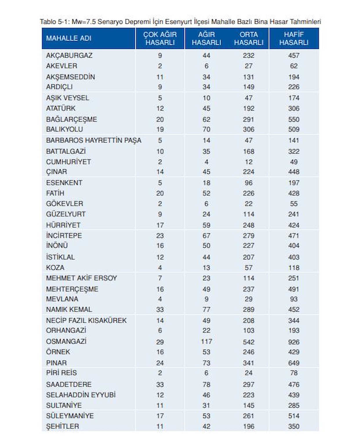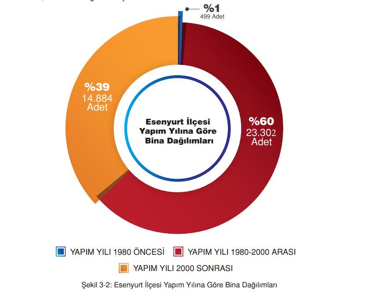 Esenyurt’ta, analiz edilen toplam bina sayısı 38.685’tir. Ağır ve çok ağır hasarlı binaların aldıkları deprem hasarının, onarılamayacak boyutta olabileceği ve bu hasar seviyelerindeki binaların yıkılıp tekrar yapılması gereğinin ortaya çıkacağı öngörülmektedir.