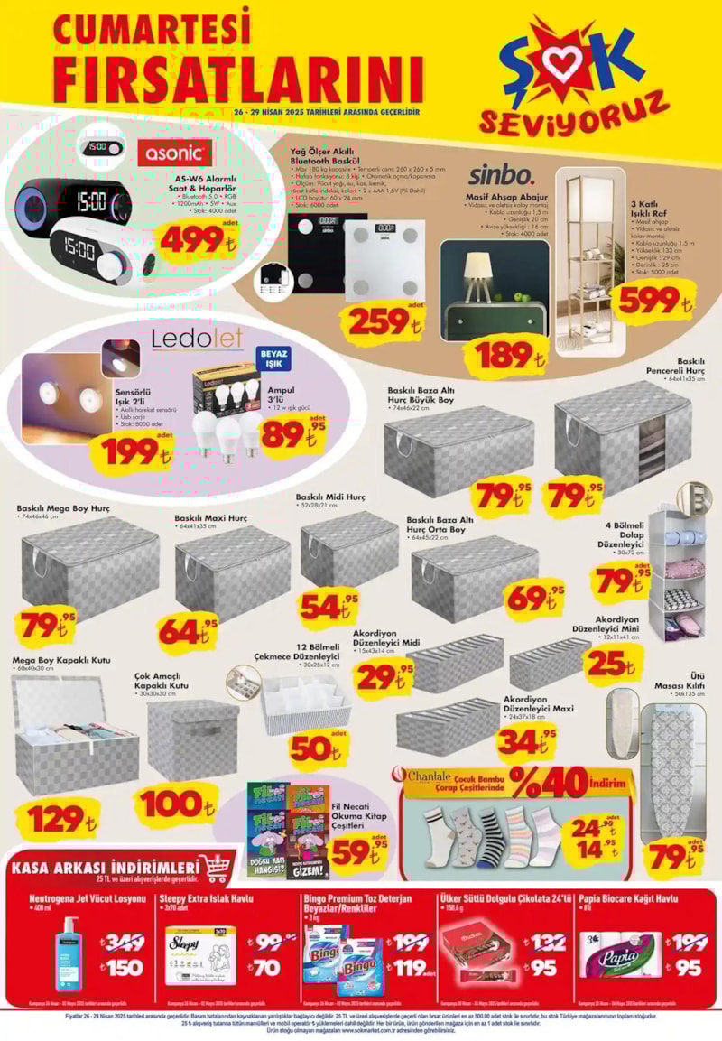 ŞOK’un 26-29 Nisan tarihleri arasında geçerli olacak yeni aktüel katalog, fırsatlarla dolu. Ev ihtiyacından kişisel bakım ürünlerine kadar pek çok kategoriye ait indirimli ürünler yer alıyor. İşte ŞOK 26 Nisan Aktüel Katalog…