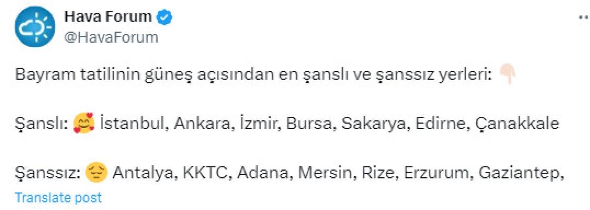 Hava Forum, Ramazan Bayramı'nda güneş açısından en şanslı ve şansız şehirleri paylaştı. Paylaşımında şu ifadeleri kullandı: