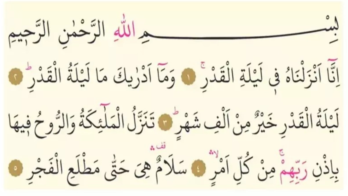 إِنَّا أَنزَلْنَاهُ فِي لَيْلَةِ الْقَدْرِ ﴿١﴾ وَمَا أَدْرَاكَ مَا لَيْلَةُ الْقَدْرِ ﴿٢﴾ لَيْلَةُ الْقَدْرِ خَيْرٌ مِّنْ أَلْفِ شَهْرٍ ﴿٣﴾ تَنَزَّلُ الْمَلَائِكَةُ وَالرُّوحُ فِيهَا بِإِذْنِ رَبِّهِم مِّن كُلِّ أَمْرٍ ﴿٤﴾ سَلَامٌ هِيَ حَتَّى مَطْلَعِ الْفَجْرِ