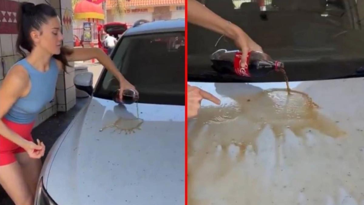 Bir kadının, arabasının kaputundaki inatçı lekeleri temizlemek için kola, kabartma tozu ve bulaşık deterjanı karışımını kullanması, sosyal medyada büyük yankı uyandırdı.