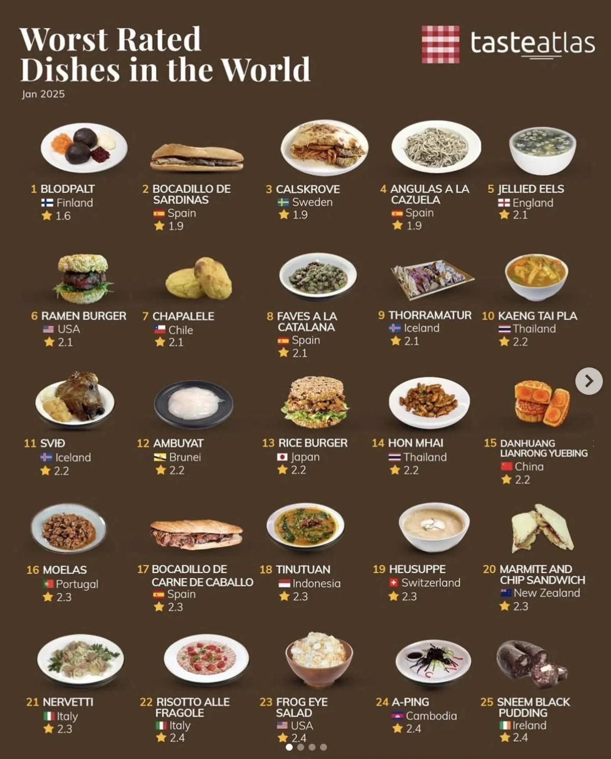 Çevrimiçi bir yemek rehberi olan Taste Atlas her yıl yaptığı oylamalar sonucunda en iyileri belirlerken aynı zamanda lezzeti çoğu kişi tarafından beğenilmeyen yemekleri de listeliyor.