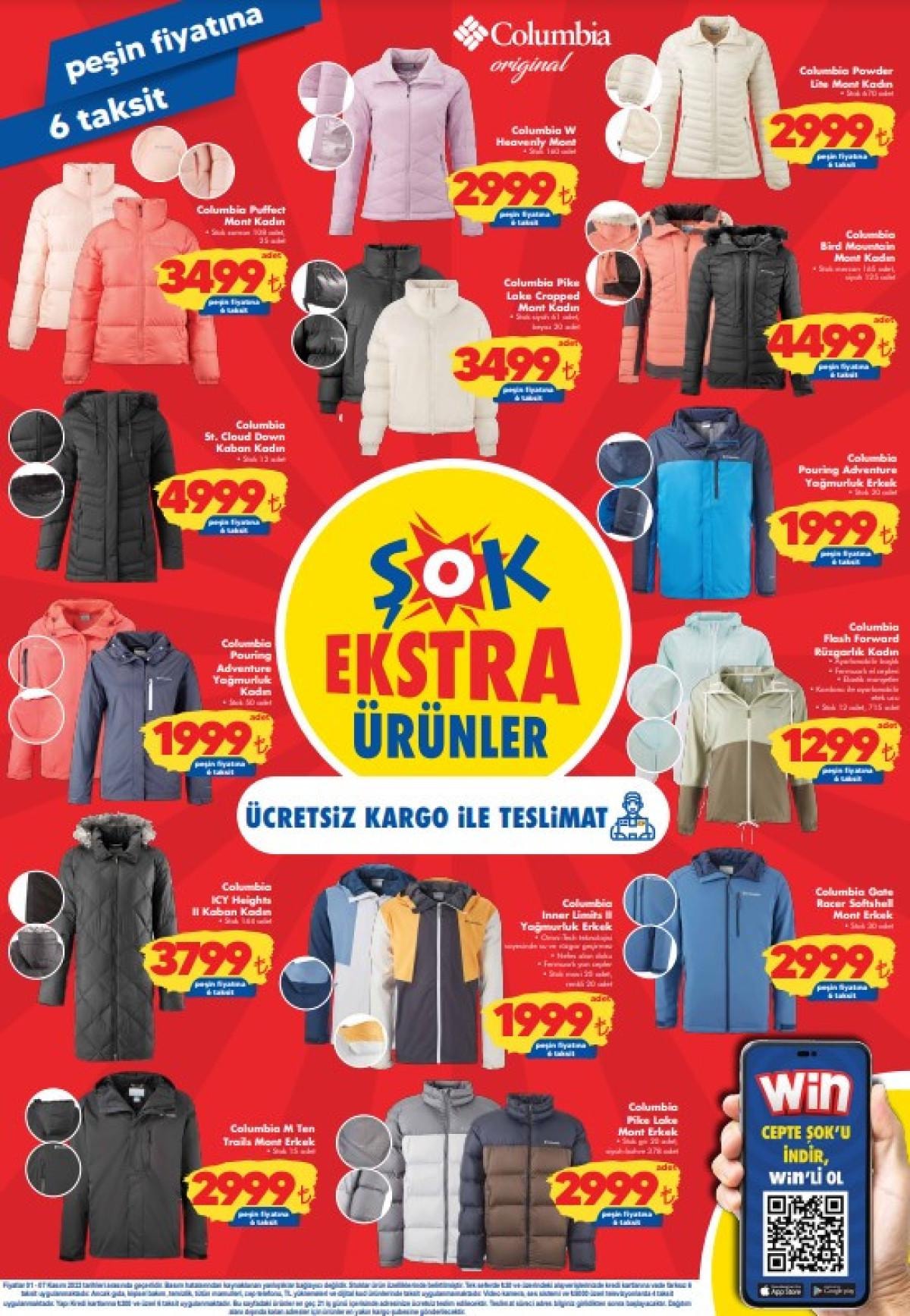 1-7 Kasım 2023 tarihleri arasında geçerli olacak olan ŞOK aktüel ürünler kataloğu, Columbia markasının kaliteli montları, yağmurlukları ve rüzgarlıklarıyla dolup taştı.