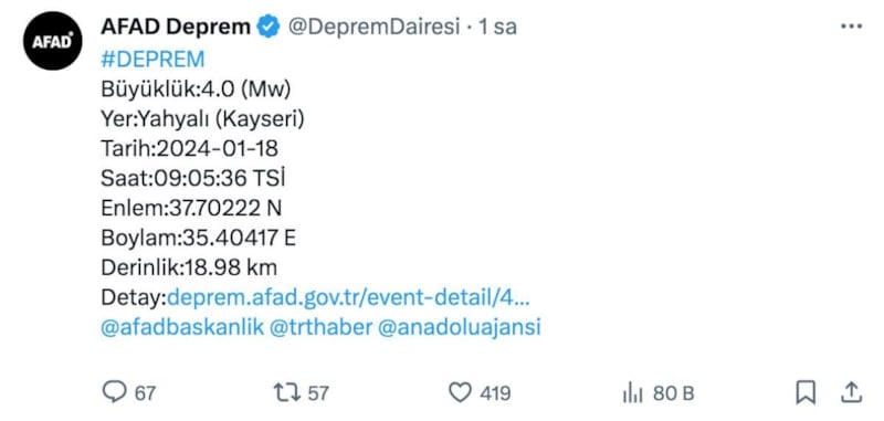 Kandilli Rasathanesi ve AFAD ülkemizde meydana gelen depremler hakkında vatandaşları bilgilendirmeye devam ediyor.