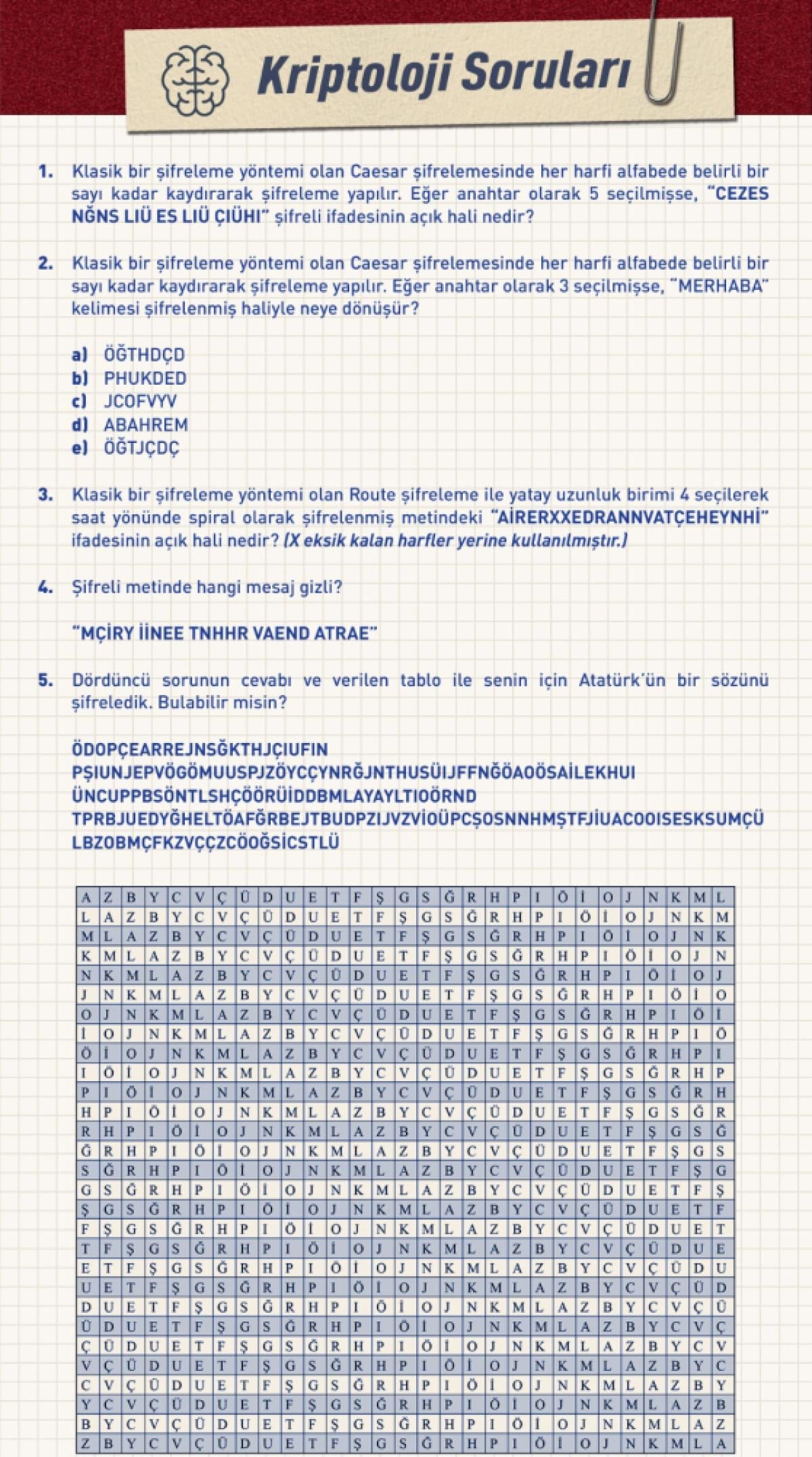 Sorular arasında, Türkiye Cumhuriyeti'nin Kurucusu Gazi Mustafa Kemal Atatürk'ün şifrelenmiş bir sözü de bulundu.