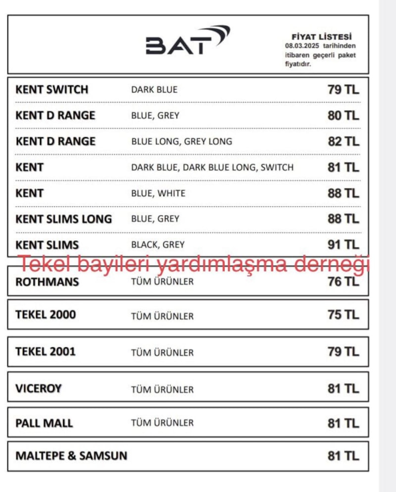 Tekel Bayileri Yardımlaşma Derneği (TBYD) Başkanı Erol Dündar, sosyal medya hesabından yaptığı açıklamada, British American Tobacco (BAT) grubuna ait sigaralara zam yapıldığını duyurdu.