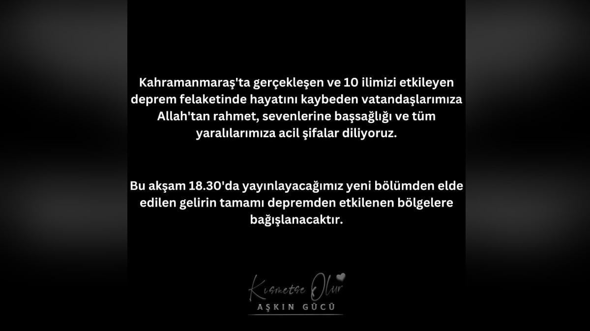 Kahramanmaraş'ta meydana gelen asrın felaketi nedeniyle birçok dizi ve program yayınlarını durdurdu. Bu programlardan biri de Kısmetse Olur Aşkın Gücü oldu.