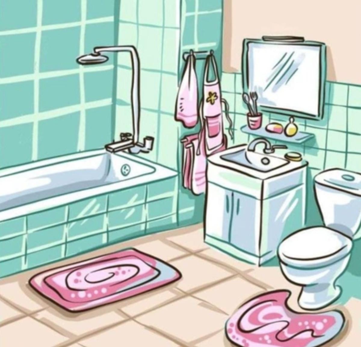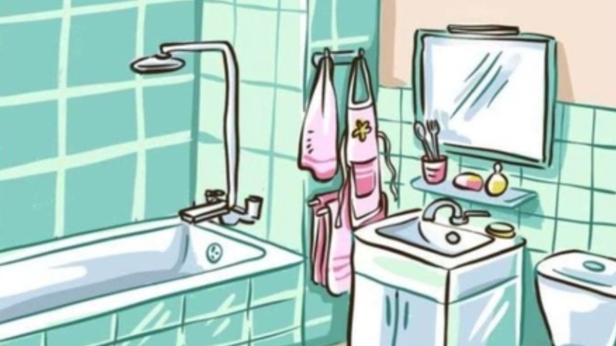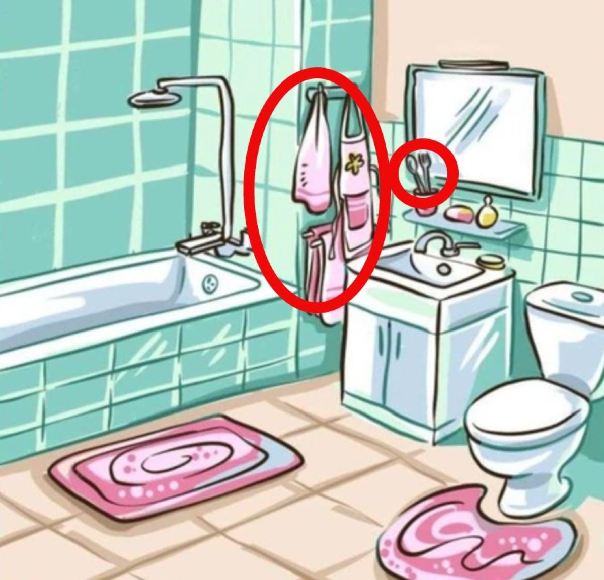 Resimdeki mantık hatası banyoda mutfak eşyalarının bulunmasıdır. Mutfak önlüğü ve çatal bıçağın banyoda olması mantıksızlık içermektedir.