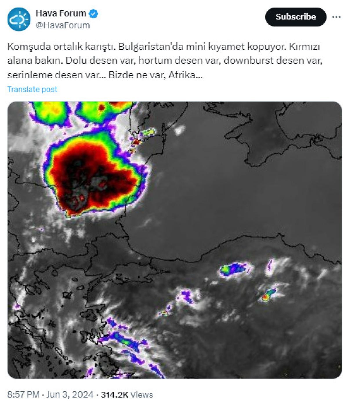 Paylaşımında, “Komşuda ortalık karıştı. Bulgaristan'da mini kıyamet kopuyor. Kırmızı alana bakın. Dolu desen var, hortum desen var, downburst desen var, serinleme desen var... Bizde ne var, Afrika...” ifadelerine yer verdi.
