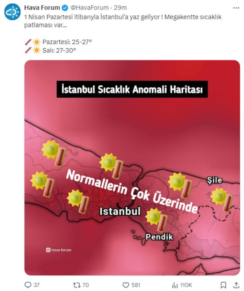 Meteoroloji kaynağı Hava Forum, sosyal medya hesabından yaptığı açıklamayla sıcaklıkların daha da artacağını belirtti.