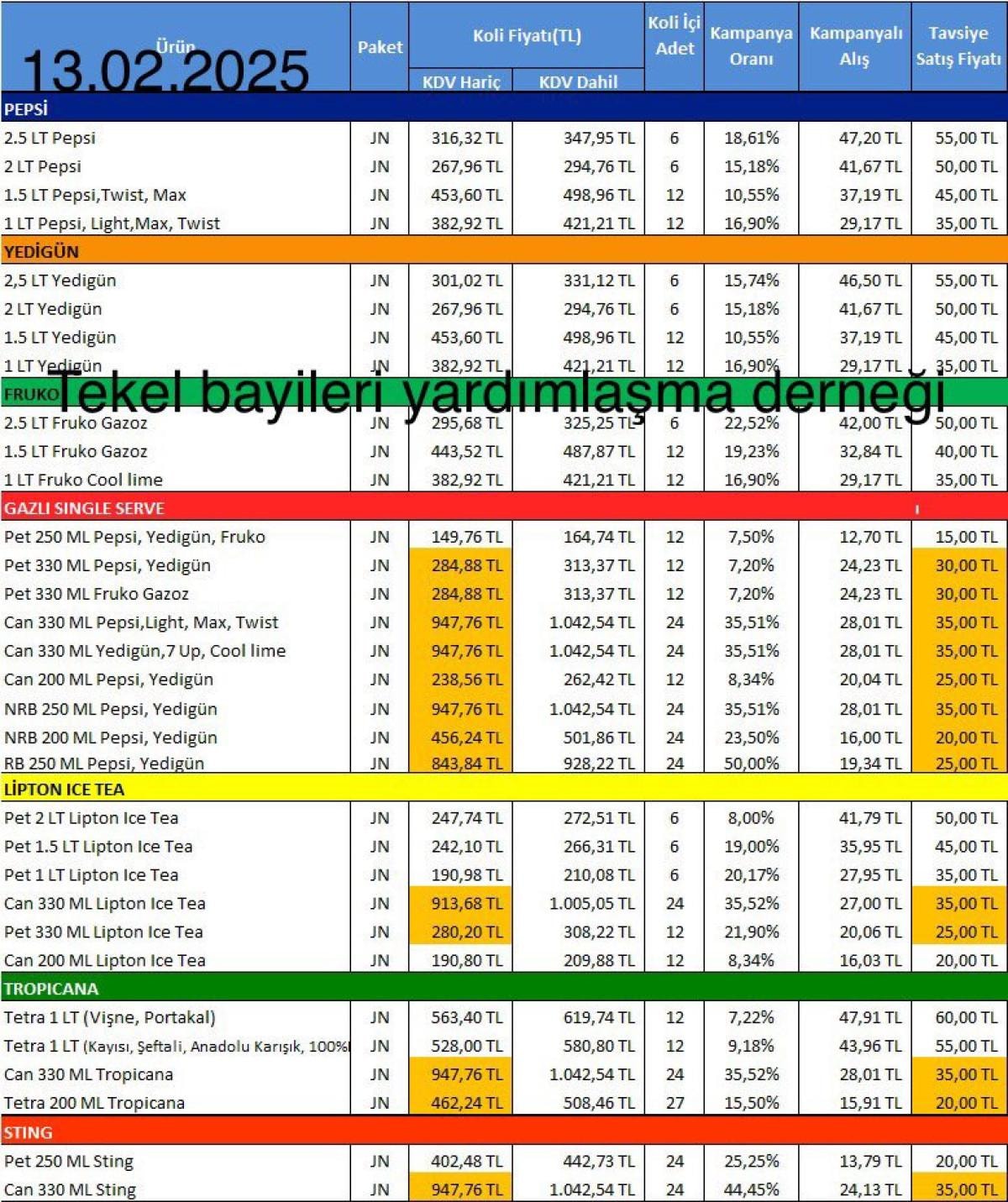 Türkiye Tekel Bayileri Yardımlaşma Derneği (TBYD) Başkanı Erol Dündar, Pepsi grubundaki içeceklerin yeni fiyatlarını duyurdu.