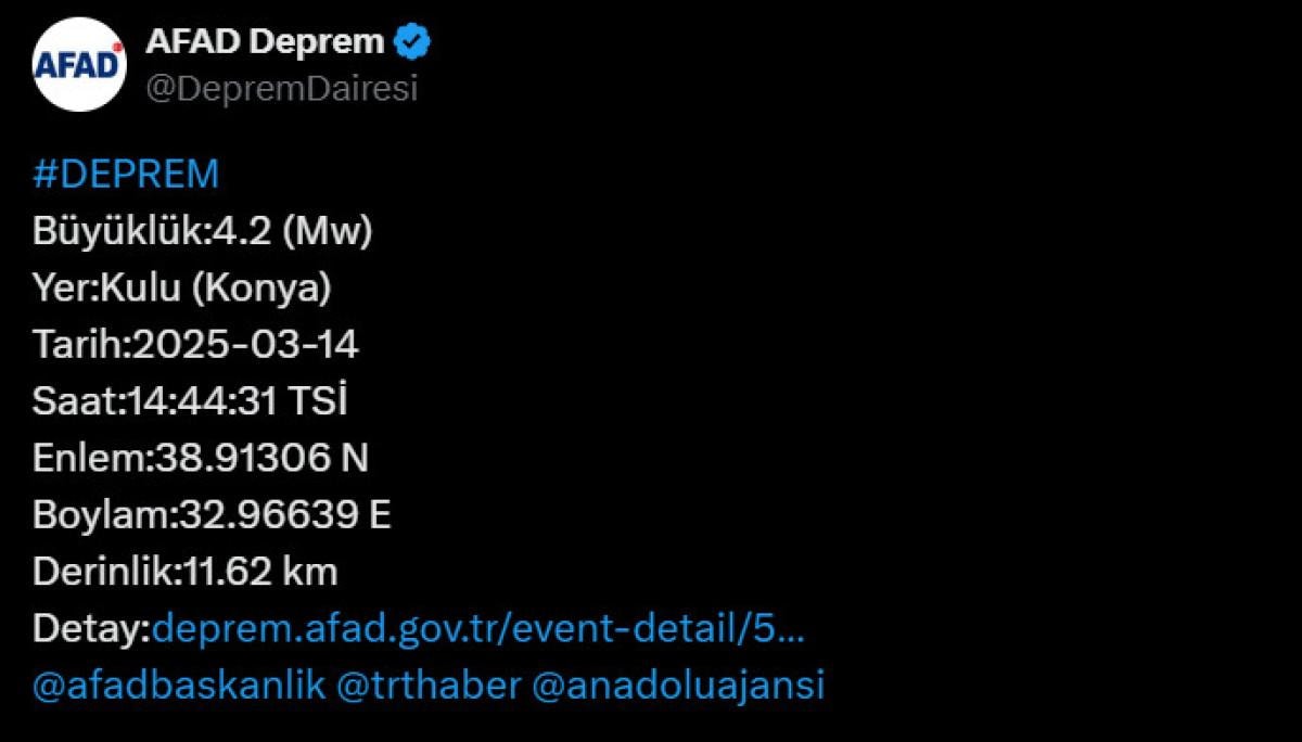 14 Mart 2025 Cuma günü Konya'nın Kulu ilçesinde 4.2 büyüklüğünde bir deprem meydana geldi.