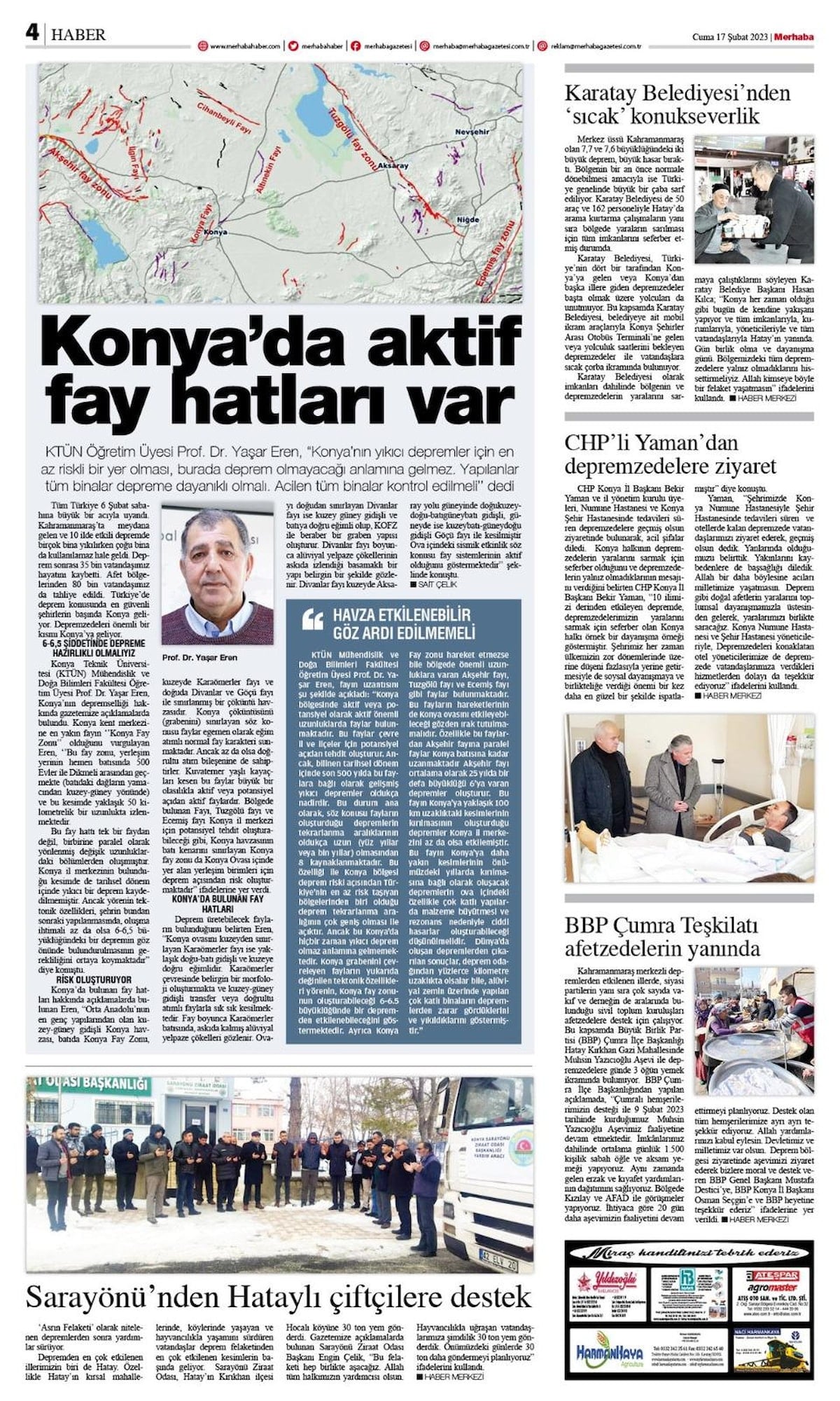 Konya'da bulunan Merhaba Gazetesi'ne konuşan Prof. Dr. Yaşar Eren "Konya'nın yıkıcı depremler için en az riskli bir yer olması, burada deprem olmayacağı anlamına gelmez. Yapılan tüm binalar depreme dayanıklı olmalı. Acilen tüm binalar kontrol edilmeli." dedi.