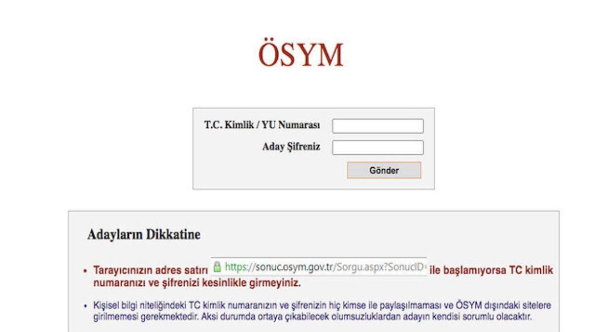 Adaylar sınav sonuçlarını, T.C. Kimlik Numaraları ve şifreleri ile ÖSYM'nin https://sonuc.osym.gov.tr internet adresinden ve mobil uygulamalarından öğrenebileceklerdir. Sınav sonuç belgesi basılmayacak ve adayların adreslerine gönderilmeyecektir.
