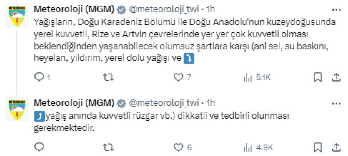 "Yağışların, Doğu Karadeniz Bölümü ile Doğu Anadolu'nun kuzeydoğusunda yerel kuvvetli, Rize ve Artvin çevrelerinde yer yer çok kuvvetli olması beklendiğinden yaşanabilecek olumsuz şartlara karşı (ani sel, su baskını, heyelan, yıldırım, yerel dolu yağışı ve yağış anında kuvvetli rüzgar vb.) dikkatli ve tedbirli olunması gerekmektedir."
