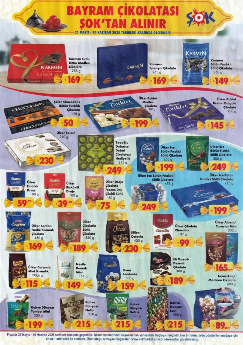 ŞOK, katalogda çeşitli marka ve çeşitlerde bayram çikolatalarını uygun fiyatlarla sunarak tatlı alışverişine renk katıyor.