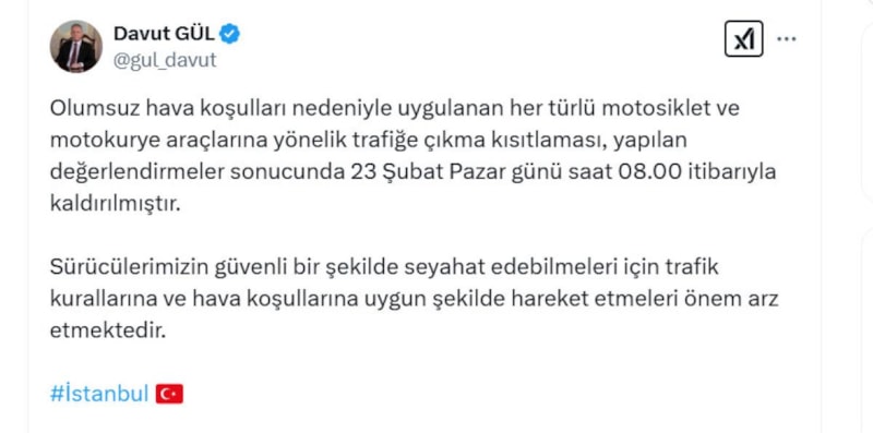 Vali Davut Gül, sosyal medya hesabından yaptığı açıklamada “Olumsuz hava koşulları nedeniyle uygulanan her türlü motosiklet ve motokurye araçlarına yönelik trafiğe çıkma kısıtlaması, yapılan değerlendirmeler sonucunda 23 Şubat Pazar günü saat 08.00 itibarıyla kaldırılmıştır.” ifadelerini kaydetti.