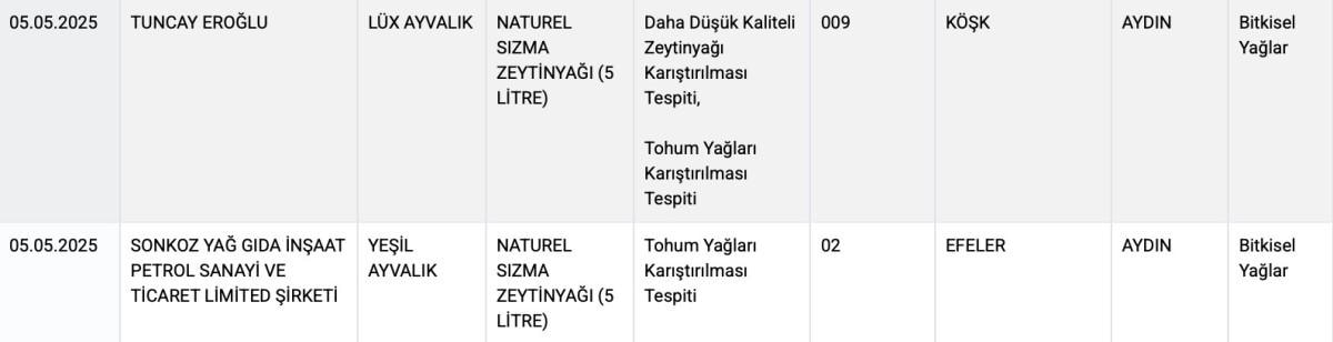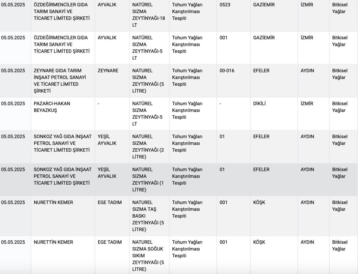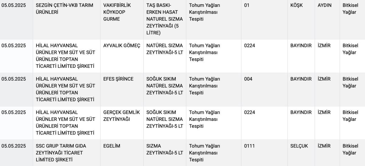 Bakanlığın denetimleri sonucunda birçok zeytinyağı markasında bitkisel yağ ve tohum yağları karıştırıldığı belirlendi.