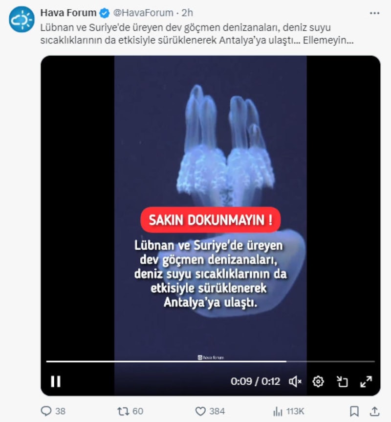 Hava Forum sosyal medyadan yaptığı paylaşımda; "Lübnan ve Suriye'de üreyen dev göçmen denizanaları, deniz suyu sıcaklıklarının da etkisiyle sürüklenerek Antalya'ya ulaştı... Ellemeyin..." ifadelerine yer verdi.