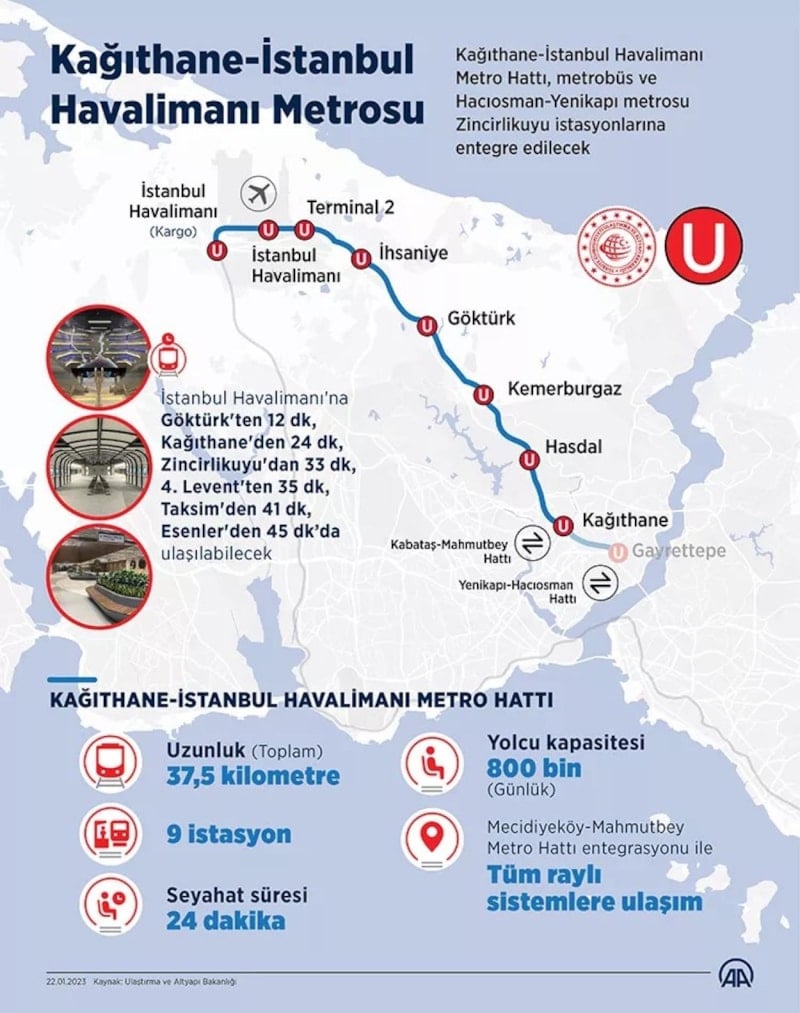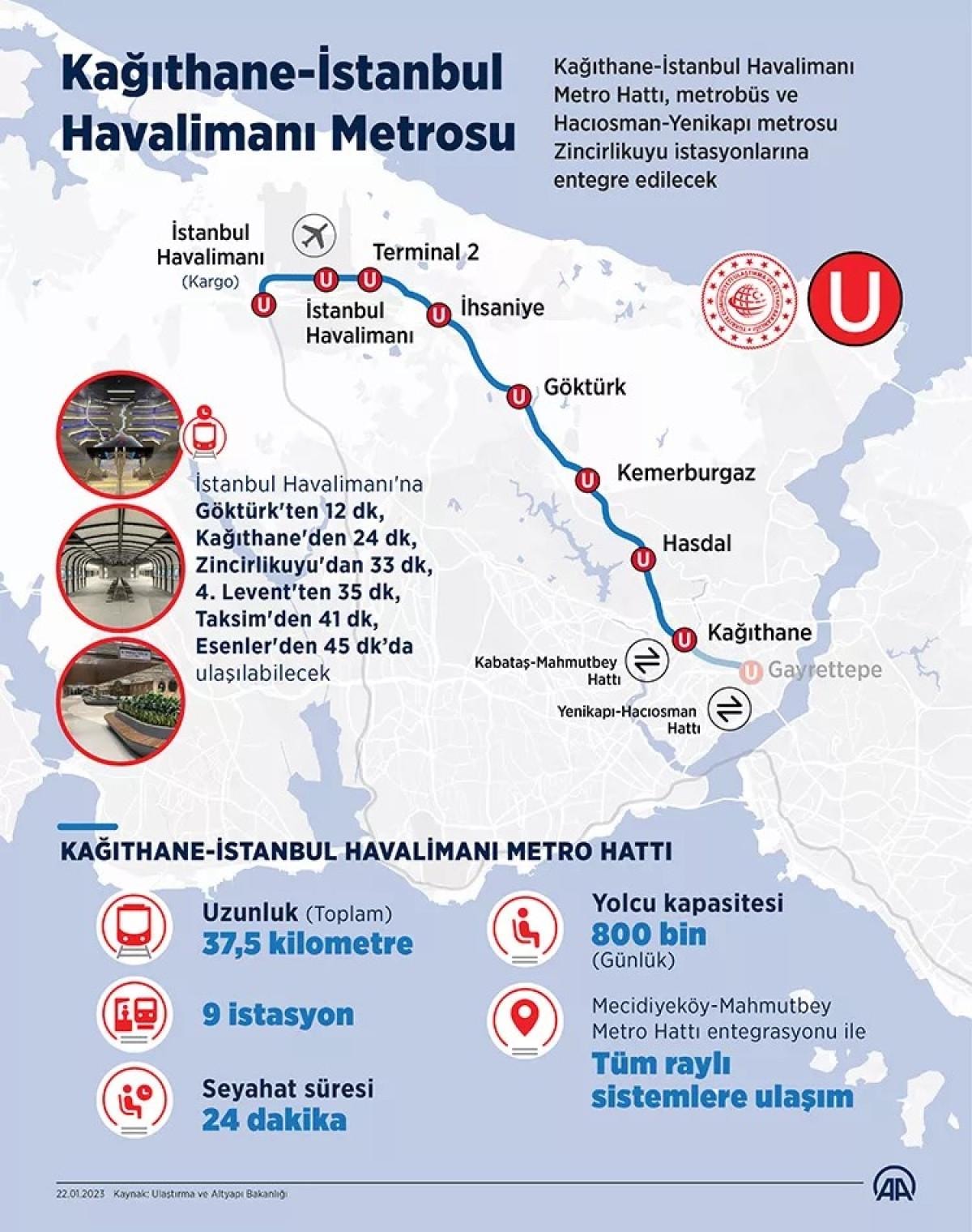 Gayrettepe Kağıthane metrosu açılışı konuşması yapan, Cumhurbaşkanı Erdoğan, "9 istasyondan oluşan ve hızı saatte 120 km'ye ulaşan hattımızın günlük yolcu kapasitesi 600 bin kişidir. Mesafe 30 dakikaya, Göktürk-Mahmutbey arası 38 dakikaya, Tekstilkent-İHL arası 45 dakikaya, Taksim-Göktürk arası 26 dakikaya inecektir. Bu hattımızın hizmete alınmasıyla İstanbul'da tamamlanan raylı sistem ağlarının uzunluğu 338,5 kilometreye çıkıyor." dedi.