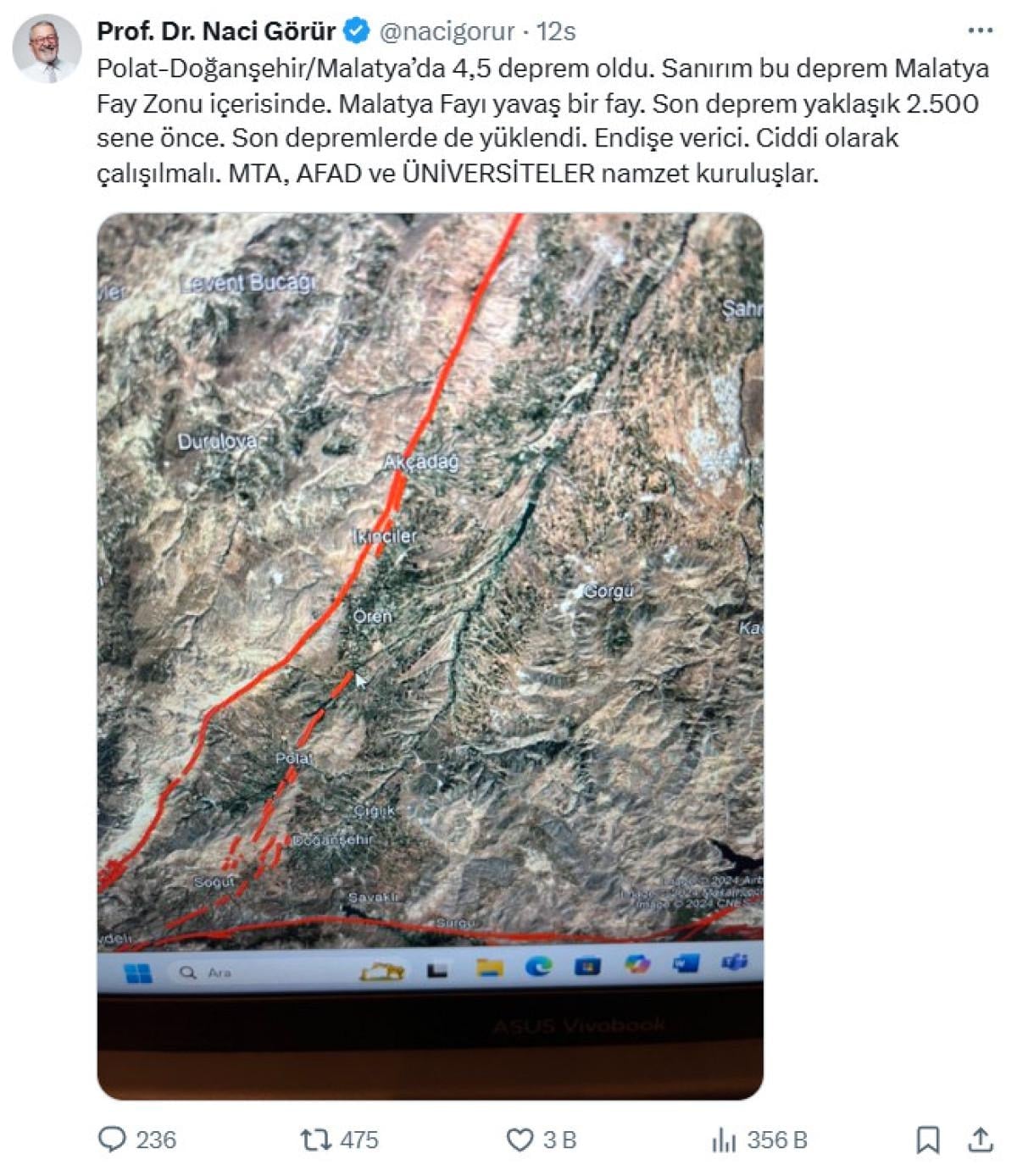 Görür yaptığı paylaşımında, "Polat-Doğanşehir/Malatya’da 4,5 deprem oldu. Sanırım bu deprem Malatya Fay Zonu içerisinde. Malatya Fayı yavaş bir fay. Son deprem yaklaşık 2.500 sene önce. Son depremlerde de yüklendi. Endişe verici. Ciddi olarak çalışılmalı. MTA, AFAD, üniversiteler ve namzet kuruluşlar..." ifadelerini kullandı.