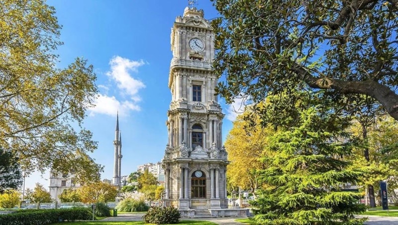 Bezmialem Valide Sultan Camii ile Dolmabahçe Sarayı Saltanat Kapısı arasında yer alan kule, gece ışıklandırmalarıyla bambaşka bir hale bürünüyor.
