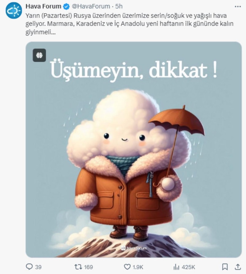 Paylaşımında; "Pazartesi Rusya üzerinden üzerimize serin/soğuk ve yağışlı hava geliyor. Marmara, Karadeniz ve İç Anadolu yeni haftanın ilk gününde kalın giyinmeli..." sözlerini kullandı.