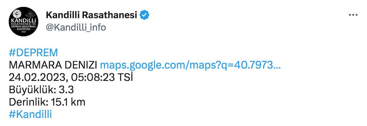 Kandilli Rasathanesi meydana gelen depremin derinliğinin ise 15.1 km olduğunu duyurdu.