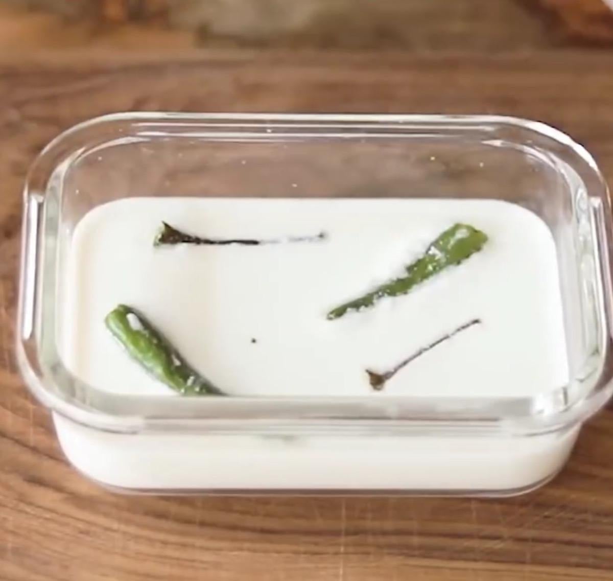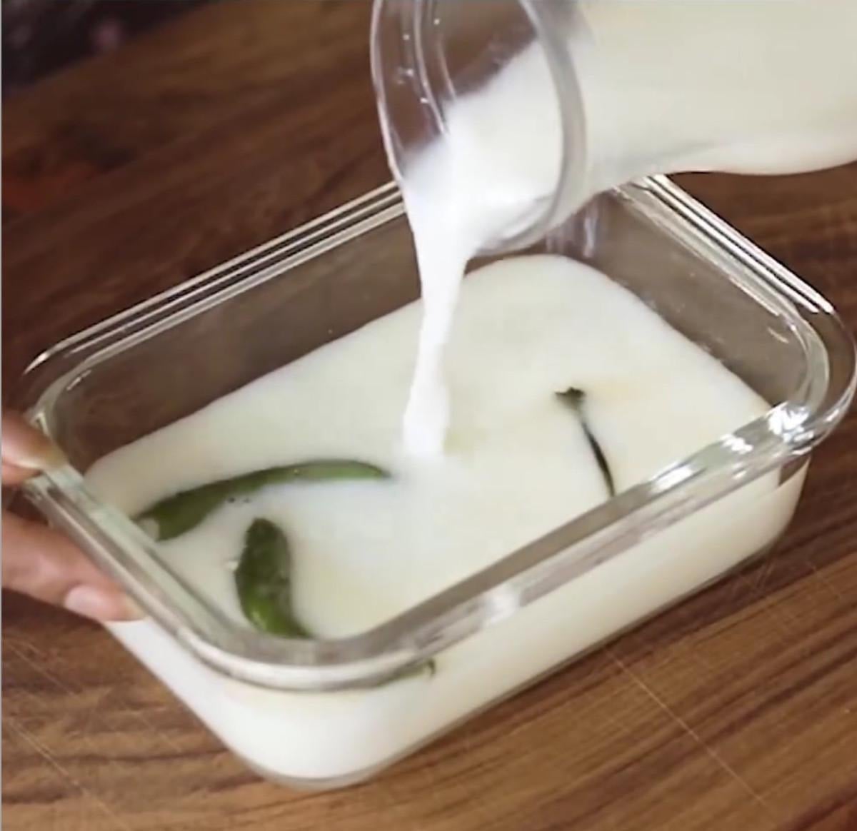 Ağzını katabileceğiniz cam bir kabın içerisine 2 adet yeşil biberin saplarını kopararak hem biber kısmını hem de sap kısmını koyun daha sonra kabın yarısına kadar ılık süt ekleyin. Daha sonra ağzını iyice kapatarak 12-14 saat aralığında bekletin.