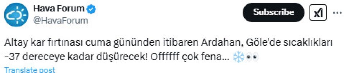 Ardahan'ın Göle ilçesinde sıcaklıkların -37 dereceye kadar düşeceğini belirten Hava Forum, paylaşımında şu sözleri kullandı: