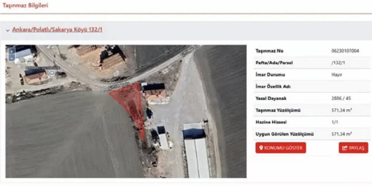 Yine Ankara’nın Polatlı ilçesinde yer alan toplamda 571,34 metrekare büyüklüğünde olan tarla 70 bin TL’lik tahmini bedelle alıcılarını bekliyor. Tıpkı arsa satışı gibi 19 Haziran 2025 tarihinde saat 10.00’da gerçekleşecek olan ihalede 21 bin TL geçici teminat bedeli ile alıcılarını bekliyor.