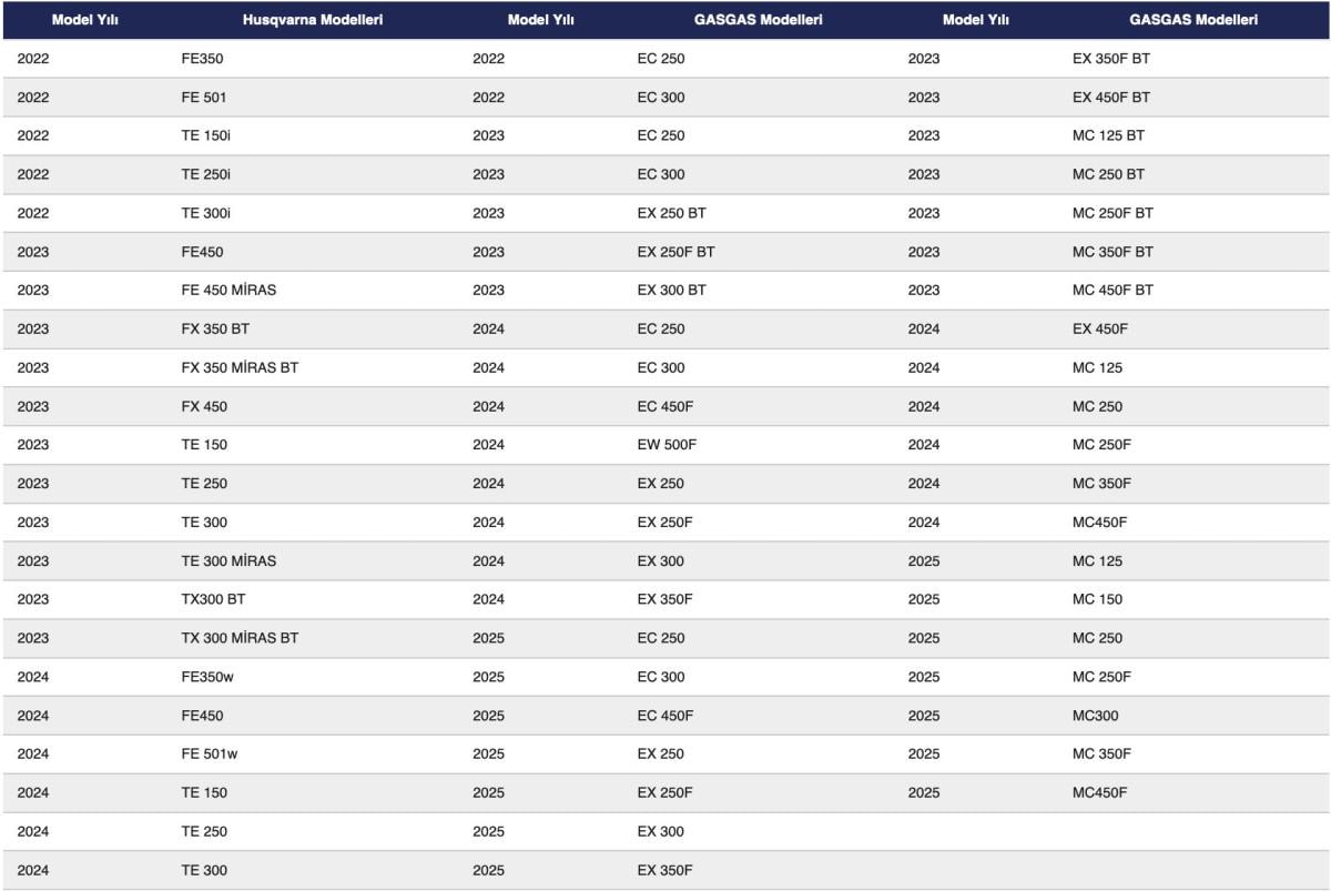 Geri çağırmadan etkilenen motosiklet sahiplerine, araçlarını derhal kullanmayı bırakmaları ve en kısa sürede yetkili bir GASGAS Motorcycles veya Husqvarna Motorcycles bayisine başvurarak ücretsiz bir muayene ve onarım randevusu almaları tavsiye ediliyor.