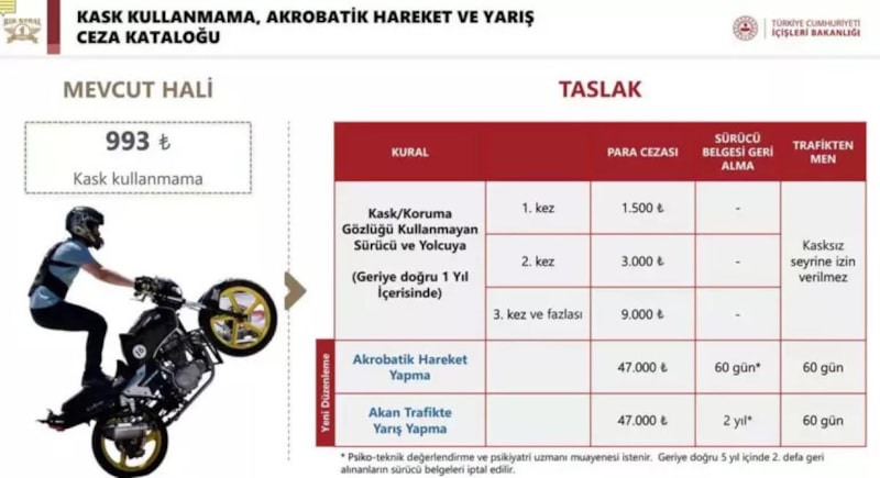 Yeni düzenleme kapsamında akrobatik hareketler yapan veya trafikte yarışa katılan motosiklet sürücülerine 47 bin TL para cezası uygulanacak.