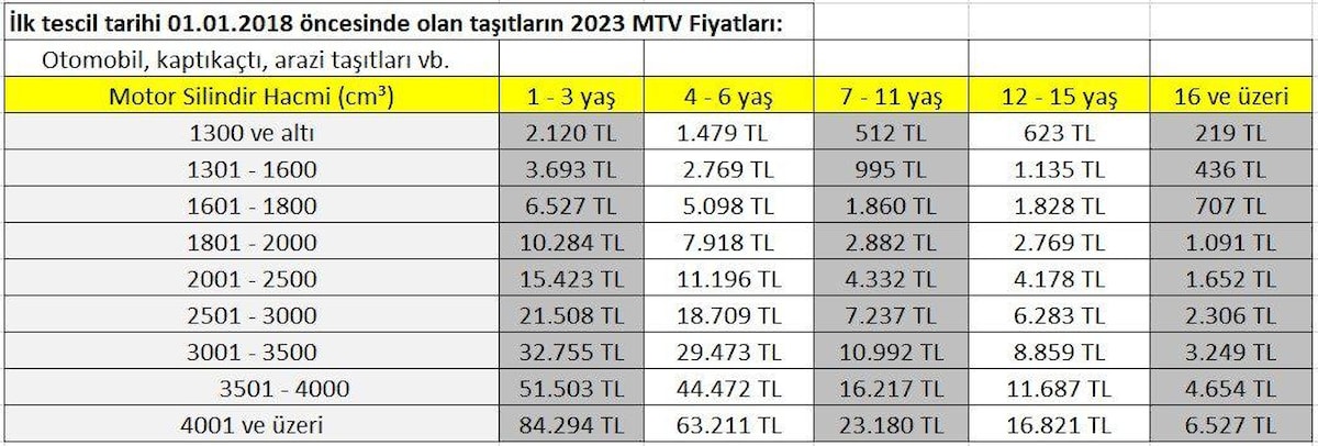 İlk tescil tarihi 01.01.2018 öncesinde olan araçların 2023 MTV fiyatları;
