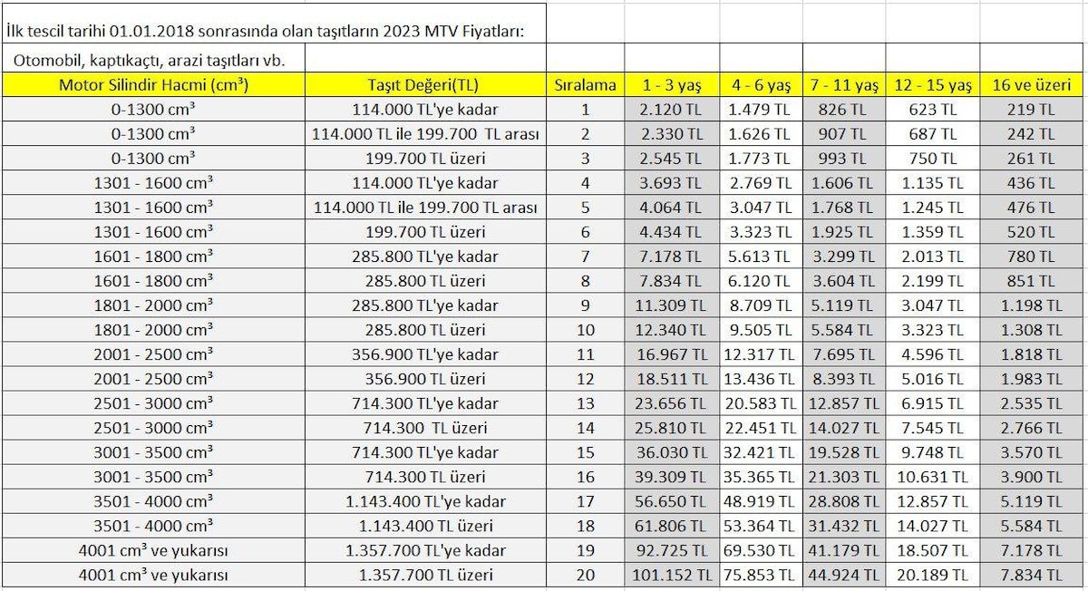 İlk tescil tarihi 01.01.2018 sonrasında olan araçların 2023 MTV fiyatları;