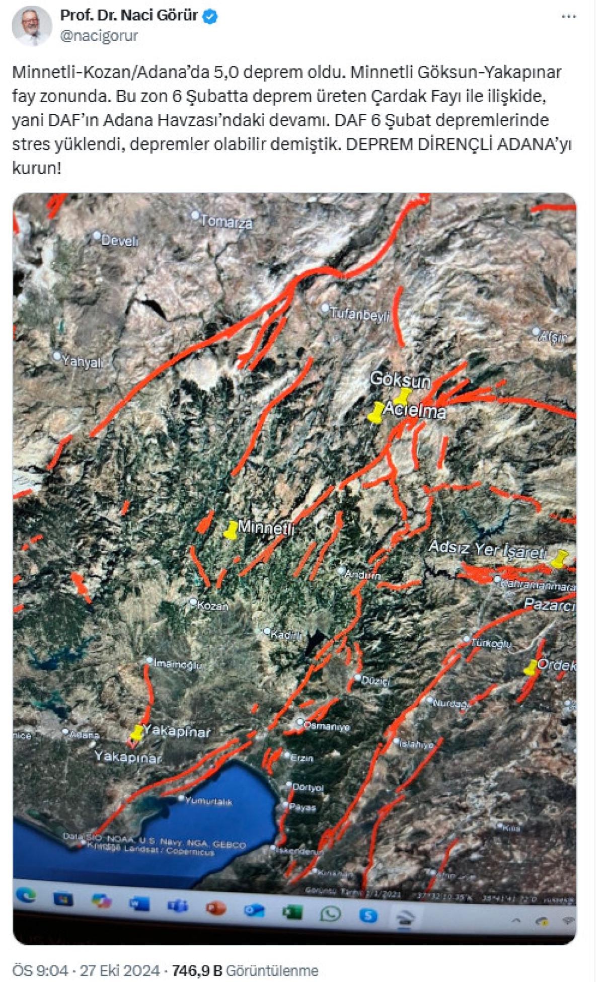 Görür yaptığı paylaşımda, "Minnetli-Kozan/Adana’da 5,0 deprem oldu. Minnetli Göksun-Yakapınar fay zonunda. Bu zon 6 Şubatta deprem üreten Çardak Fayı ile ilişkide, yani DAF’ın Adana Havzası’ndaki devamı. DAF 6 Şubat depremlerinde stres yüklendi, depremler olabilir demiştik. DEPREM DİRENÇLİ ADANA’yı kurun!" ifadelerini kullandı.