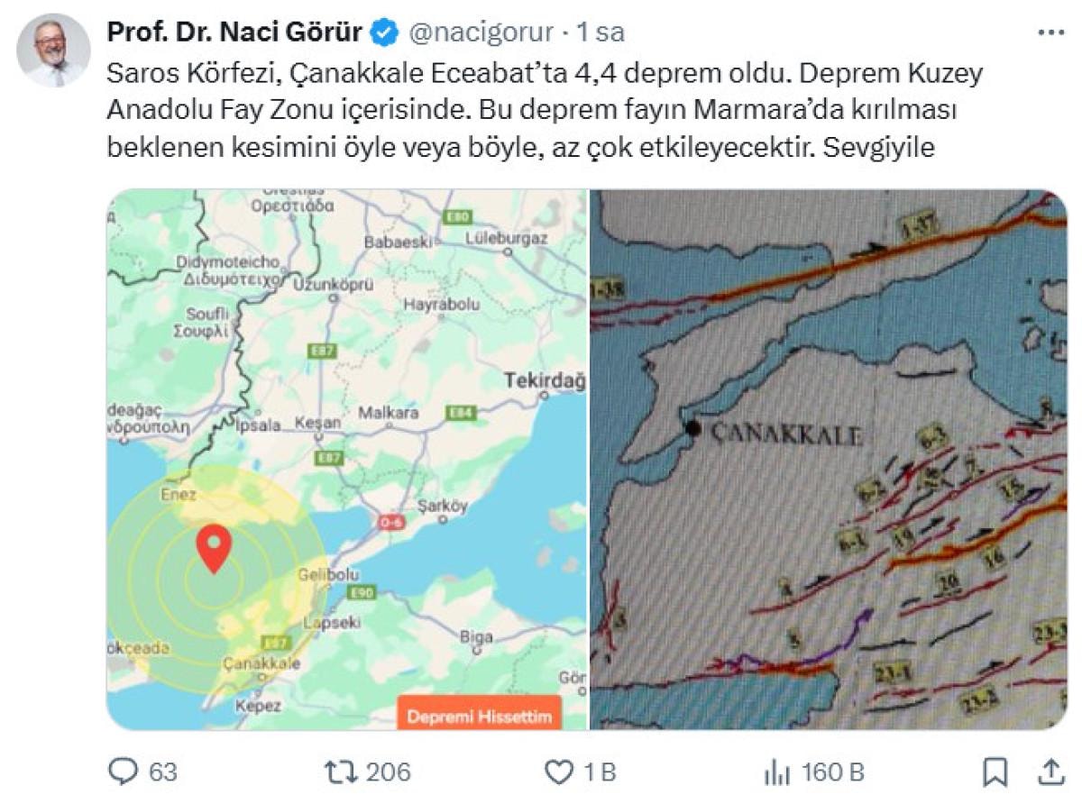 Görür X hesabı üzerinden yaptığı açıklamasında, “Saros Körfezi, Çanakkale Eceabat’ta 4,4 büyüklüğünde bir deprem oldu. Bu deprem, fayın Marmara’da kırılması beklenen kesimini öyle ya da böyle az çok etkileyecektir.” ifadelerini kullandı.