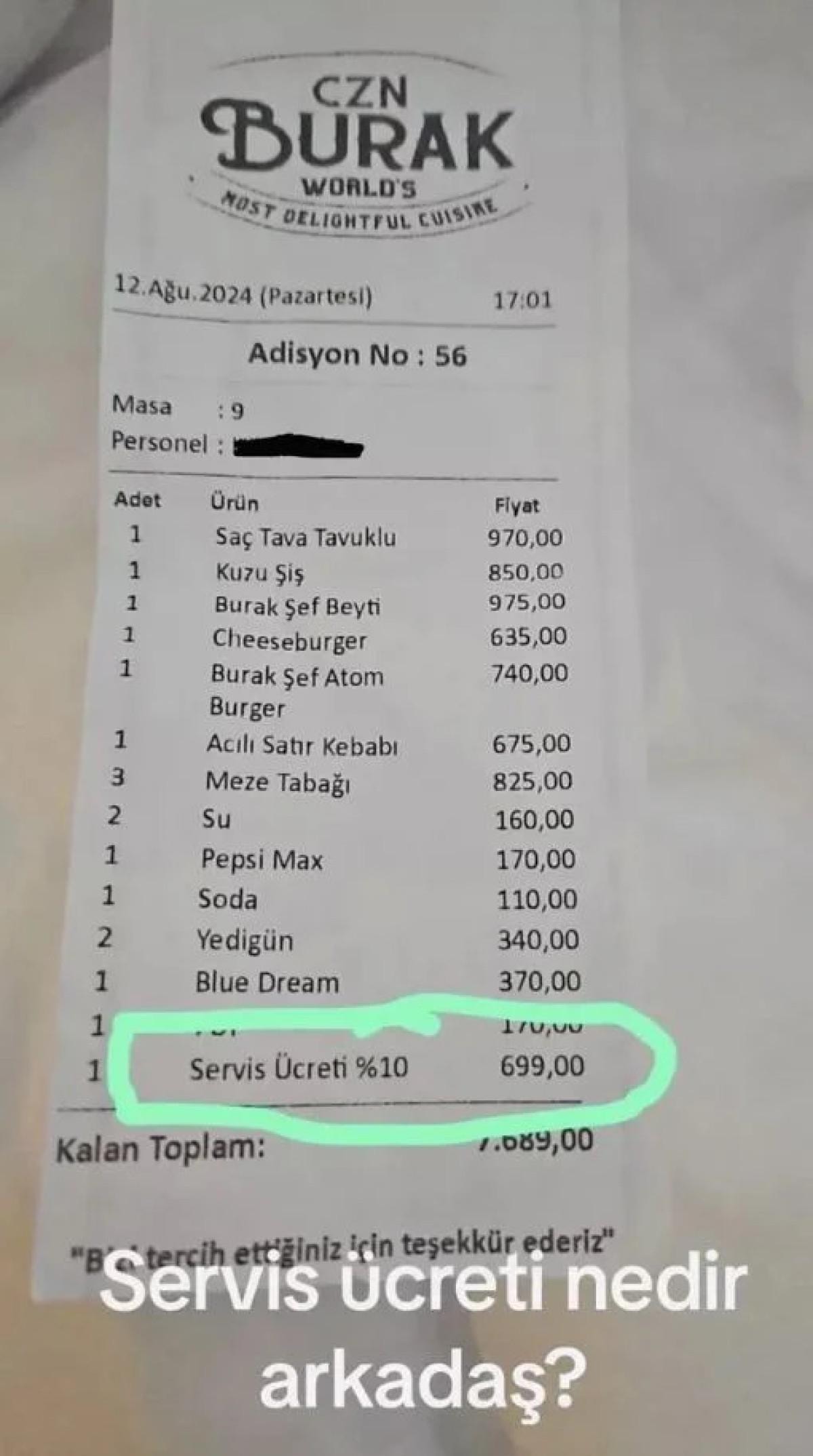 Uçuk adisyon tutarlarıyla nam salmış Nusret Gökçe’nin ardından CZN Burak’ta adisyonda müşteriye yansıtılan servis ücretiyle görenleri şaşkına çevirmeyi başardı.