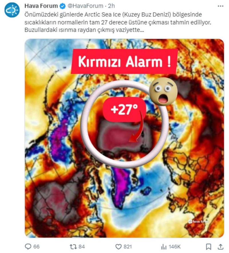 "Önümüzdeki günlerde Arctic Sea Ice (Kuzey Buz Denizi) bölgesinde sıcaklıkların normallerin tam 27 derece üstüne çıkması tahmin ediliyor. Buzullardaki ısınma raydan çıkmış vaziyette..."