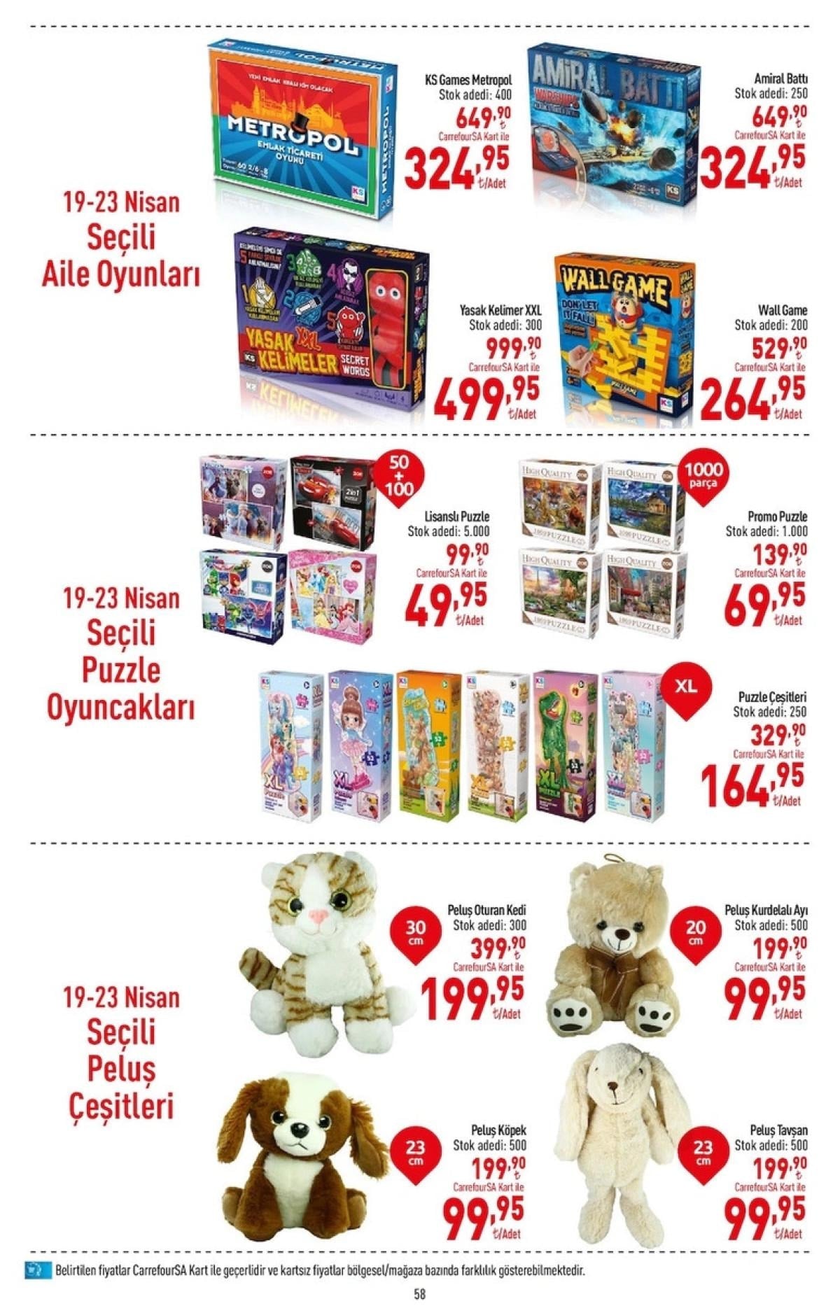 Carrefoursa Kart sahibi müşteriler için ise ekstra avantajlar var! Yarı fiyatına satılan ürünlerle aile oyunları, puzzle çeşitleri ve sevimli peluş oyuncaklar gibi ürünlerde büyük indirimler sizleri bekliyor.
