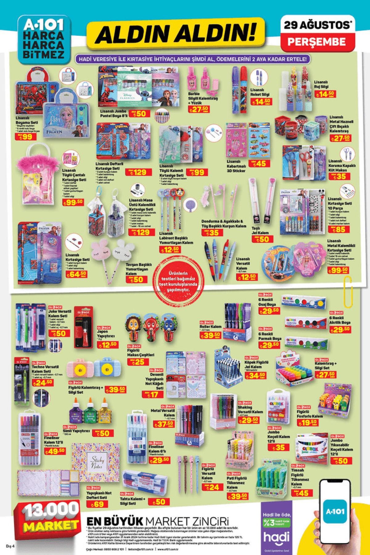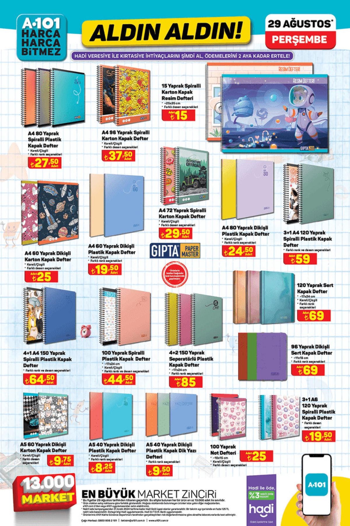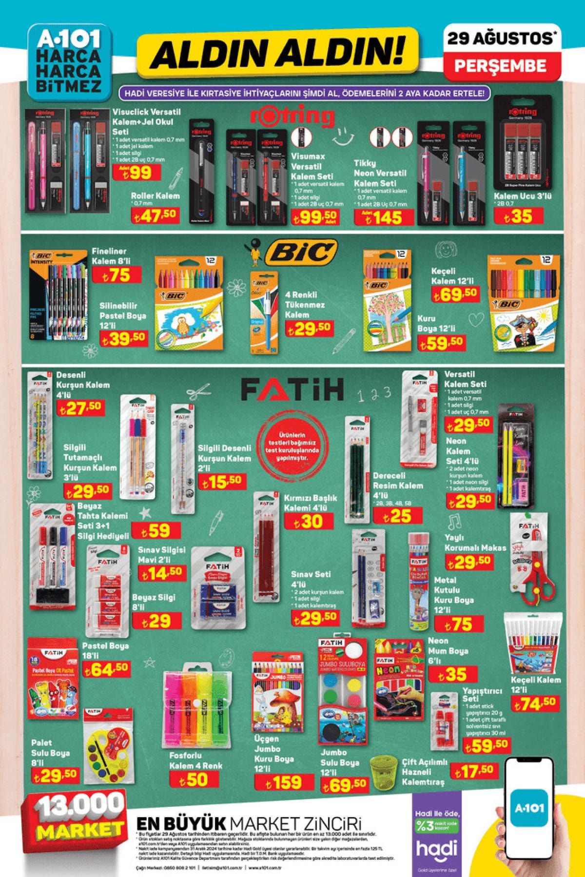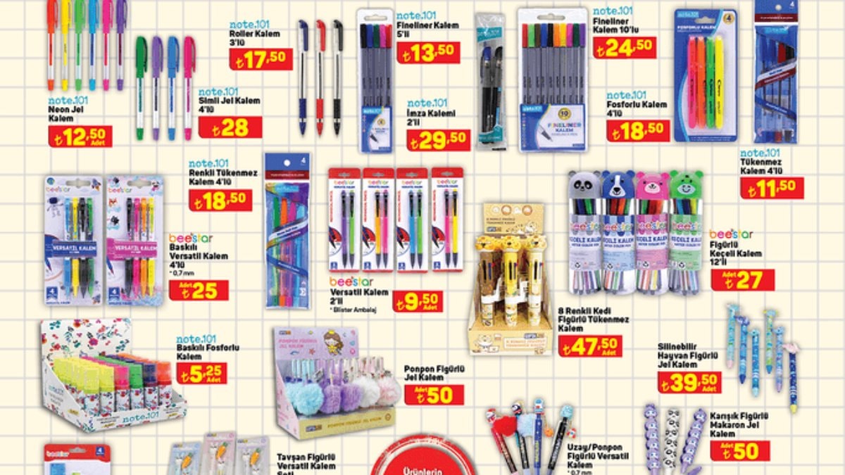 A101 kırtasiye ürünler kataloğunda; Defter, kalem, boya, klasör, A4 kağıdı, dosya, okul çantası ve kırtasiye setleri yer alıyor.
