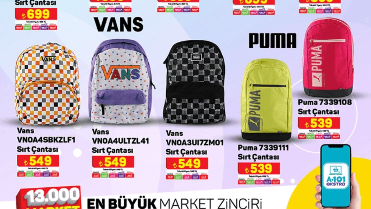 Adidas, Puma, VANS, Under Armour gibi markaların sırt çantalarını getiren A101, cazip fiyat etiketleriyle dikkat çekti.