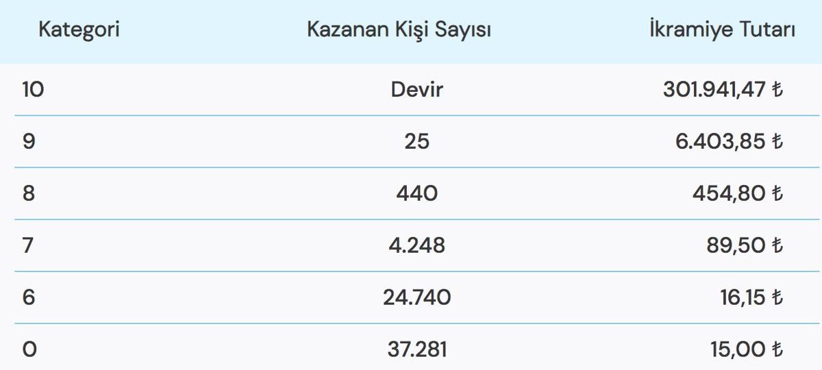 Çekiliş sonuçlarını öğrenmek isteyen şans oyunu tutkunları aramalarına hız kazandırdı. Büyük ikramiyenin 301.941,47 TL olduğu çekilişte 10 bilen çıkmadığı için ikramiye devretti.