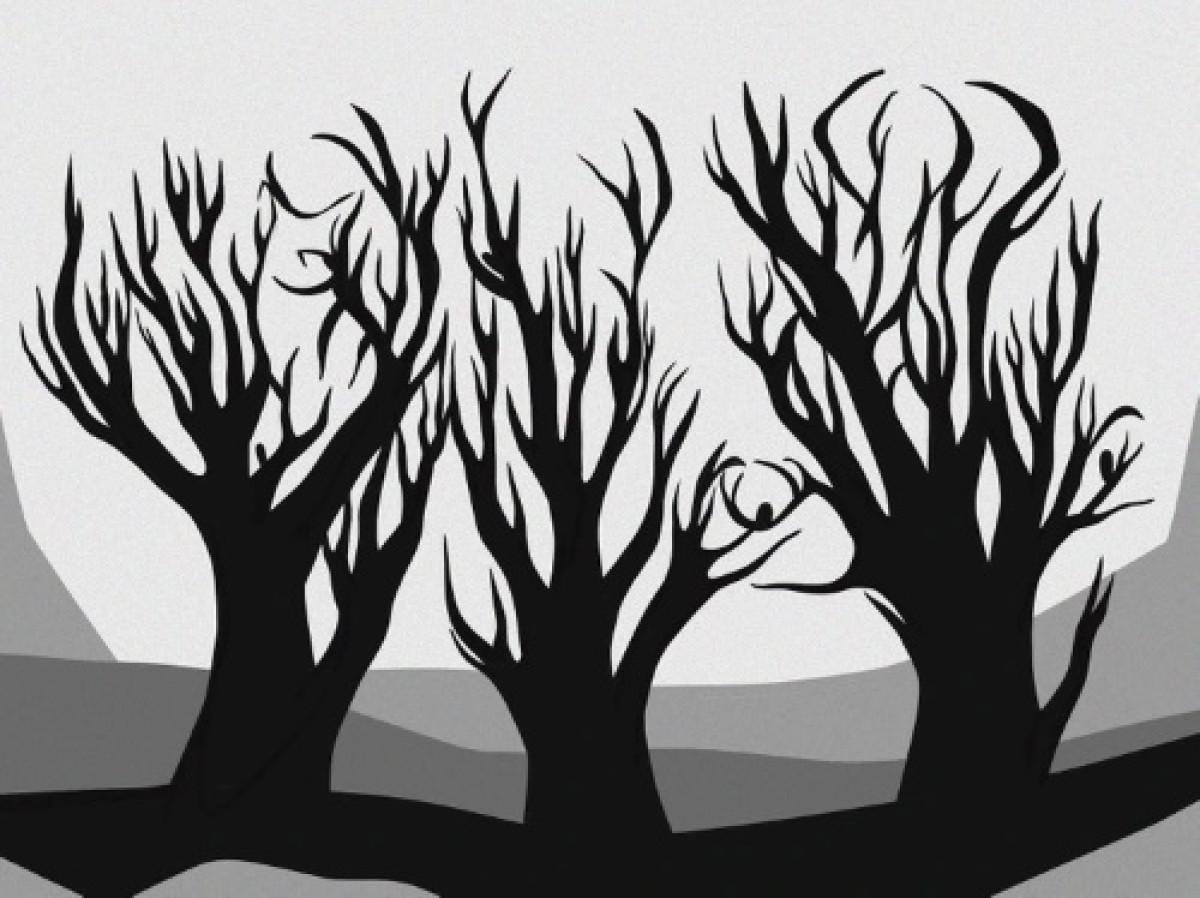 Sahne, gri tonlamalı bir arka plana karşı yapraksız ağaçların bulunduğu karanlık, stilize bir ormanı tasvir ediyor ve sahneye biraz gerçeküstü veya sanatsal bir dokunuş kattığı için biraz ürkütücü, tek renkli bir ton yaratıyor.