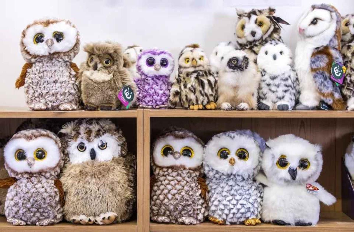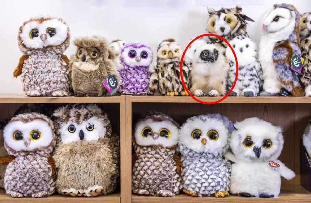 Resimde bir grup oyuncak baykuş yer alıyor. Ancak içlerinden biri gerçek.